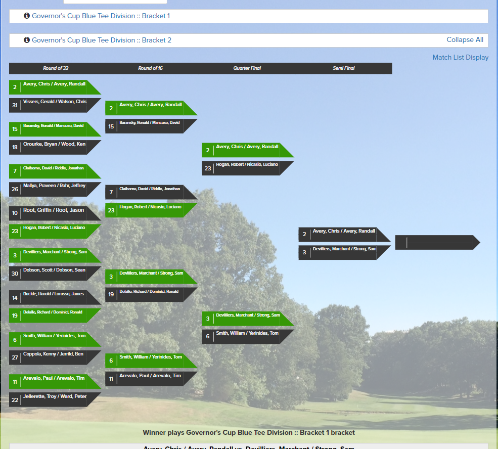 - Governors’ Cup--(Fourball Format-Round of 32) Open to first 32 two-man teams and alternates (both team players must be association members and have active handicap indexes to sign up) Teams will arrange their own matches to be completed by deadline dates)